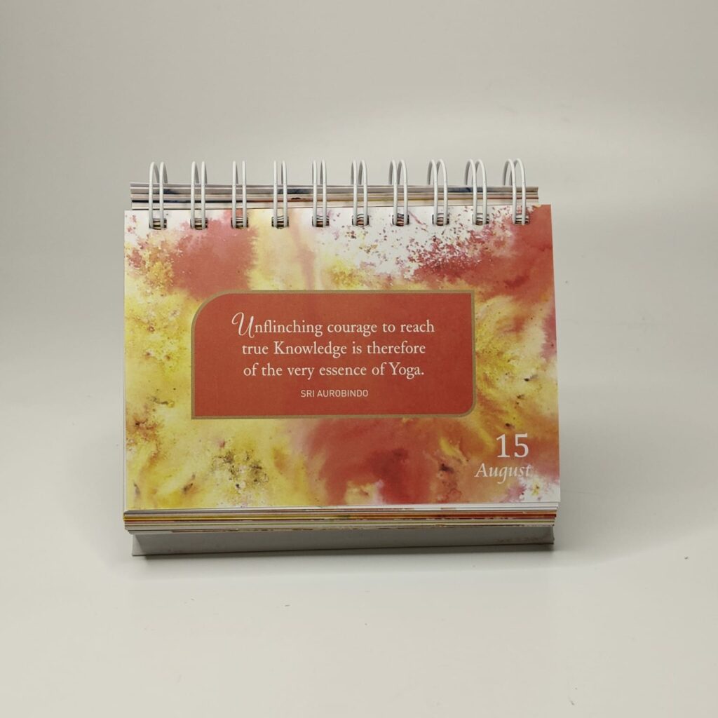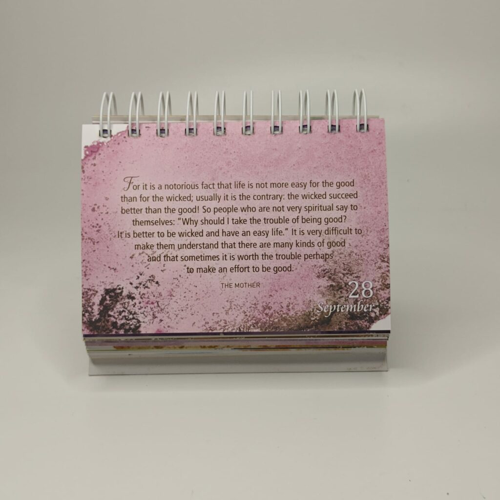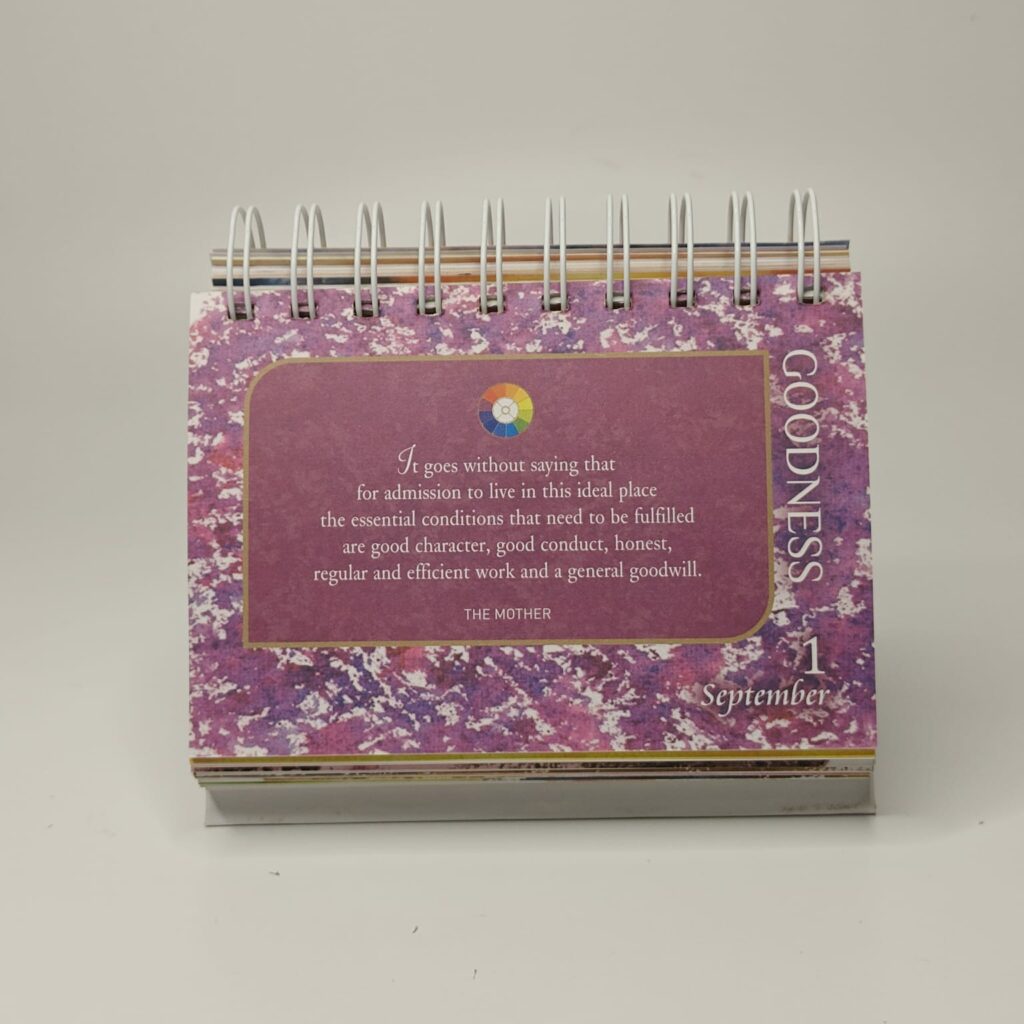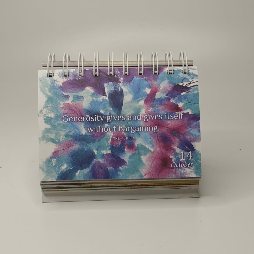 The Mother of the Sri Aurobindo Ashram too has a symbol. And needless to say, it can and does and will carry her devotees forward on their journey. But in order to do that, one must first step into the depths of Intention. What did She want to say? What did She want from us? It is this that we seek to reveal in the words of Sri Aurobindo and the Mother, day after day, month after month, year after year. A calendar that lives for perpetuity. A calendar where the seeds are sown into our subconscious and as we evolve, they flourish and blossom in our being, carrying us on the wings of realisation. A calendar that becomes an intense study, where every day shows us a new way of looking at the old. A fresh perspective every day, every year.